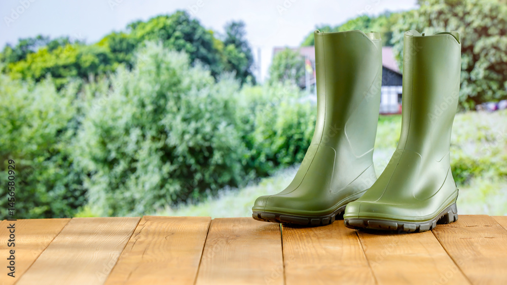 Green rubber boots on wooden table or platform - outdoor product with green lush garden background. Copy space for eco-friendly gardening products display.