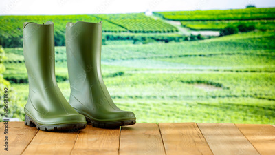 Green rubber boots on wooden table or platform - outdoor product with green lush garden background. Copy space for eco-friendly gardening products display.