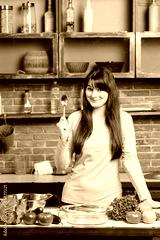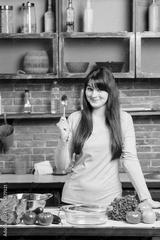 Woman holds a spoon in her hand.Young Woman Cooking in the kitchen at home. Healthy Food. Diet.