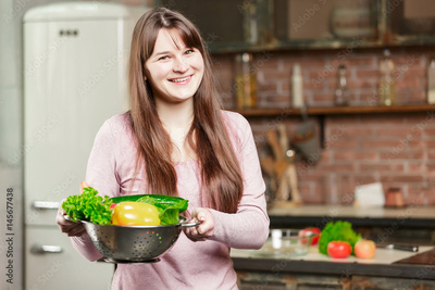 Woman holding a bowl with fresh vegetables and smiling at the camera.Young Woman Cooking in the kitchen at home.