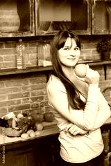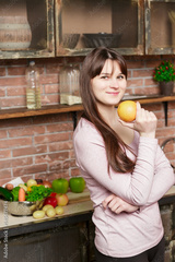 Woman holds an orange in her hand.Young Woman Cooking in the kitchen at home. Healthy Food. Diet.