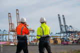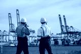 Industrial engineer workers operations marine port cranes loading and unloading of cargo ships global trade and supply chain import export environment monitoring responsible global economy.