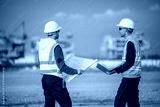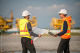 Engineer or construction worker in discussion reviewing plans project stand in front construction machinery, likely used for heavy lifting common in infrastructure or industrial development concept.