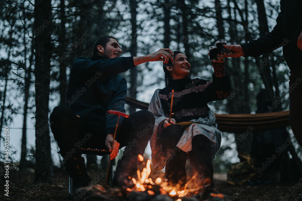 A cozy gathering of friends around a warm campfire, relaxing and sharing moments in a serene forest setting during the colder months.