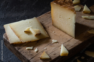 Italian hard cheese pecorino toscano sliced and chopped on wooden board on dark rustic background