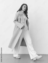 Stylish woman in beige coat, white turtleneck, and trousers walks confidently. Light brown hair, casual yet sophisticated look. Neutral tones enhance the elegant and modern outfit