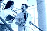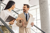 Two businesspeople descending staircase at corporate company and discussing project while smiling at each other.