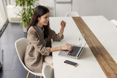 Young busy female manager sitting at corporate office and typing on a laptop while smiling at it.