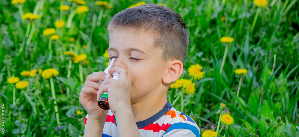 Children's allergy to flowers. Boy on a background of dandelions, allergy, sneezing