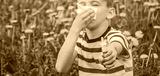 Children's allergy to flowers. Boy on a background of dandelions, allergy, sneezing