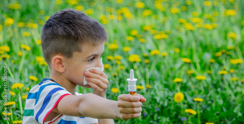 Children's allergy to flowers. Boy on a background of dandelions, allergy, sneezing