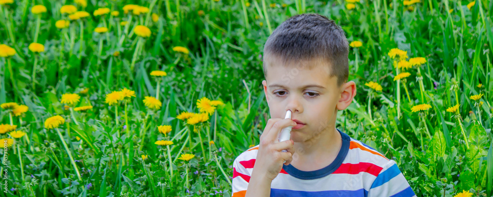 Children's allergy to flowers. Boy on a background of dandelions, allergy, sneezing