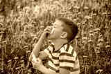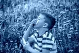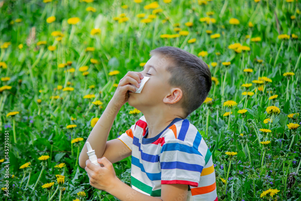 Children's allergy to flowers. Boy on a background of dandelions, allergy, sneezing