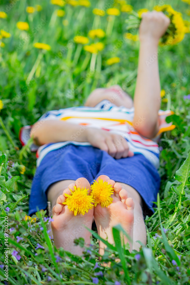Close up of a child barefoot with yellow dandelion flowers on fresh green grass.Summer spring season