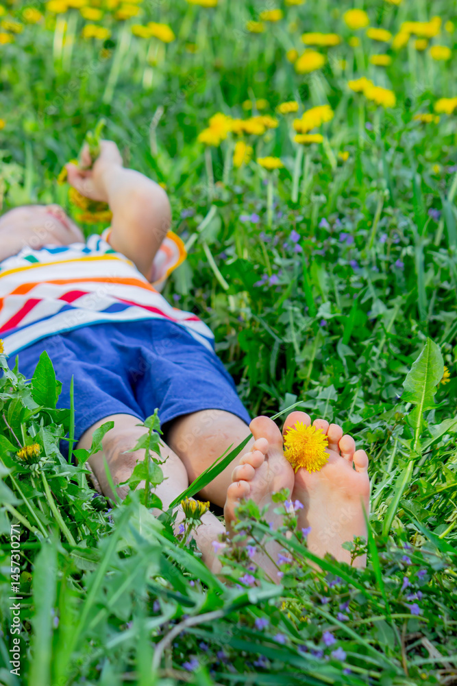Close up of a child barefoot with yellow dandelion flowers on fresh green grass.Summer spring season