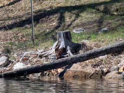dead tree stump on the lakeshore with a fallen tree in the lake
