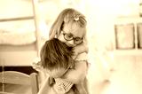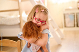girl with glasses hugs doll warmly in cozy bedroom setting. child shows affection and comfort in playful, heartwarming scene reflecting innocence and childhood memories