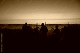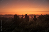 Group of hunters with shotguns going through rural field towards forest during sunset with orange sky and forest on horizon