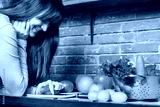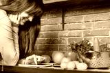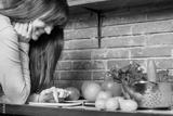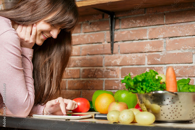 Girl look at the tablet.Young Woman Cooking in the kitchen at home. Healthy Food.