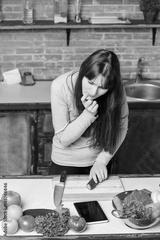 Girl look at the tablet.Young Woman Cooking in the kitchen at home. Healthy Food.