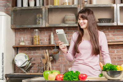 Girl look at the tablet.Young Woman Cooking in the kitchen at home. Healthy Food.