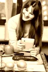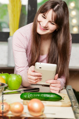Girl look at the tablet.Young Woman Cooking in the kitchen at home. Healthy Food.