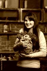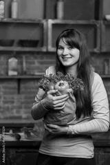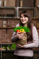 Young Woman Cooking in the kitchen at home.The girl in the kitchen holds a paper bag with fresh vegetables and greens