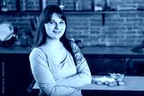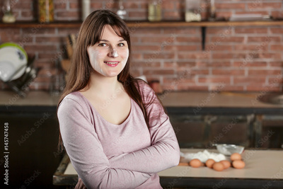 A young brunette sifts through a sieve on a kitchen table. On the table lay eggs.
