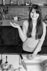 portrait of beautiful woman slice, cutting tomato in the kitchen, cooking, prepare vegetable salad, looking at camera .