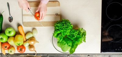 portrait of beautiful woman slice, cutting tomato in the kitchen, cooking, prepare vegetable salad.