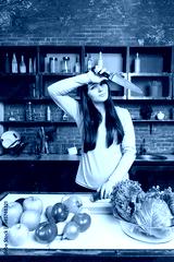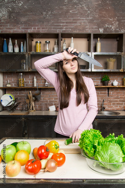 A woman cuts a cucumber in the kitchen with a knife. Preparation of salad.Woman tired cooks, clings to the head