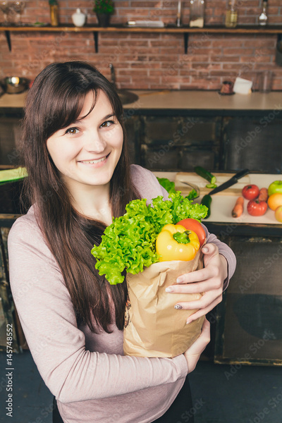 Young woman holding grocery shopping bag with vegetables Standing in the kitchen