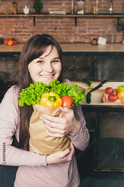 Young woman holding grocery shopping bag with vegetables Standing in the kitchen