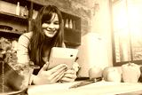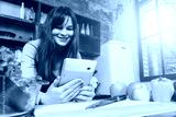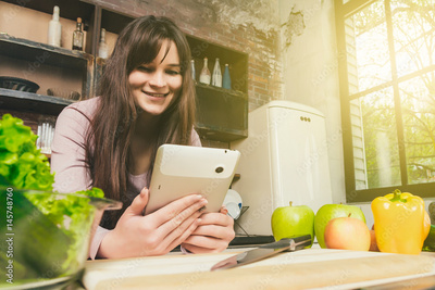 A young brunette in the morning sunny kitchen with a window prepares healthy food.Woman Using Digital Tablet