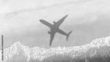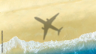 Aerial view of shadow passenger plane silhouette and sandy beach blue sea with waves at sea beach summer vacation sea travel concept