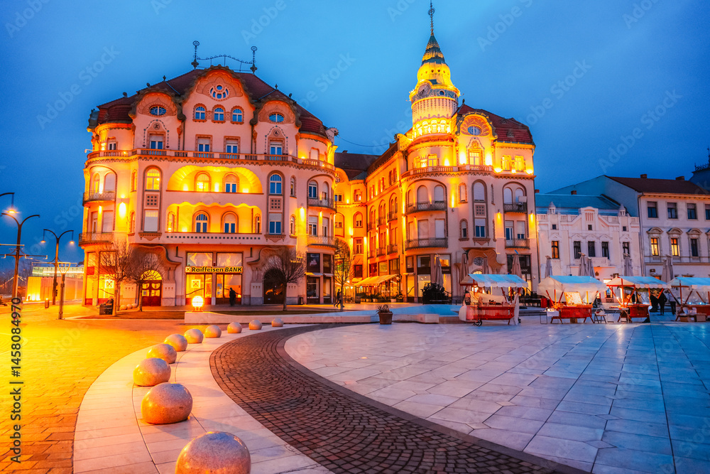 Oradea, Romania with The Black Eagle Palace (Palatul Vulturul Negru in Western Transylvania in Romania. Historical cultural city in europe