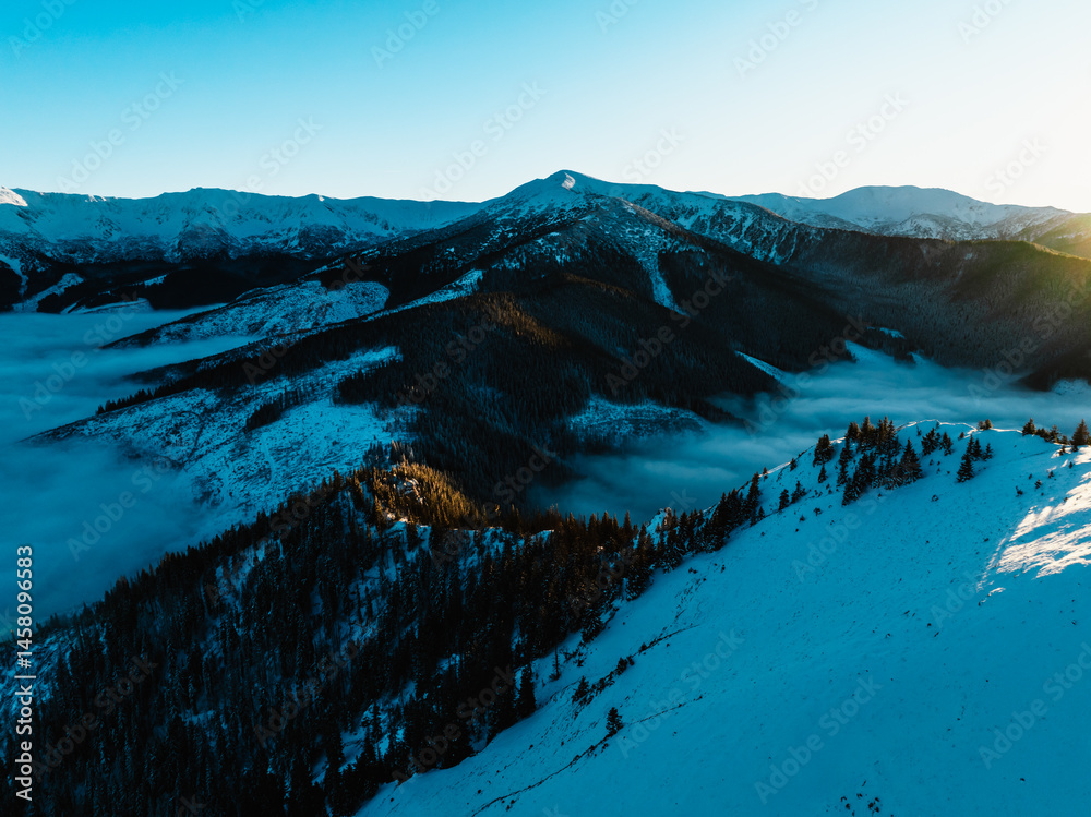 Winter hiking to Sina in Low Tatras National park near jasna is full of beautiful views. Sunset in Slovakia mountains with Chopok peak.