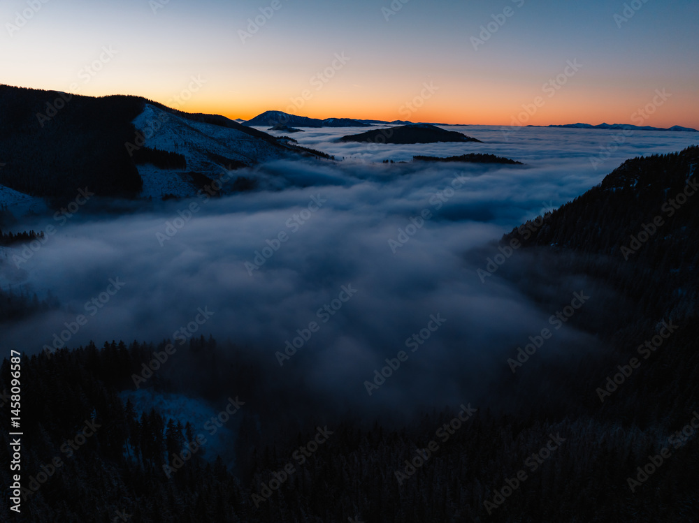 Winter hiking to Sina in Low Tatras National park near jasna is full of beautiful views. Sunset in Slovakia mountains with Chopok peak.