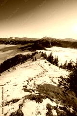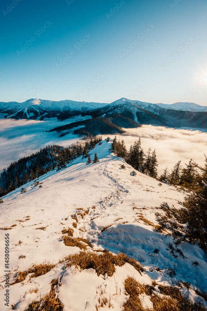 Winter hiking to Sina in Low Tatras National park near jasna is full of beautiful views. Sunset in Slovakia mountains with Chopok peak.