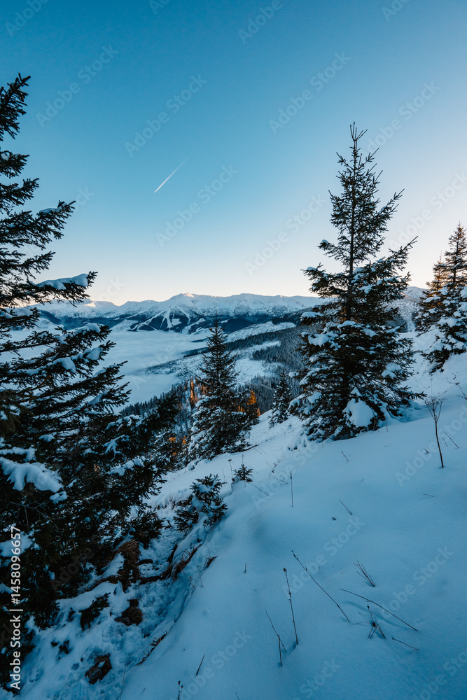 Winter hiking to Sina in Low Tatras National park near jasna is full of beautiful views. Sunset in Slovakia mountains with Chopok peak.