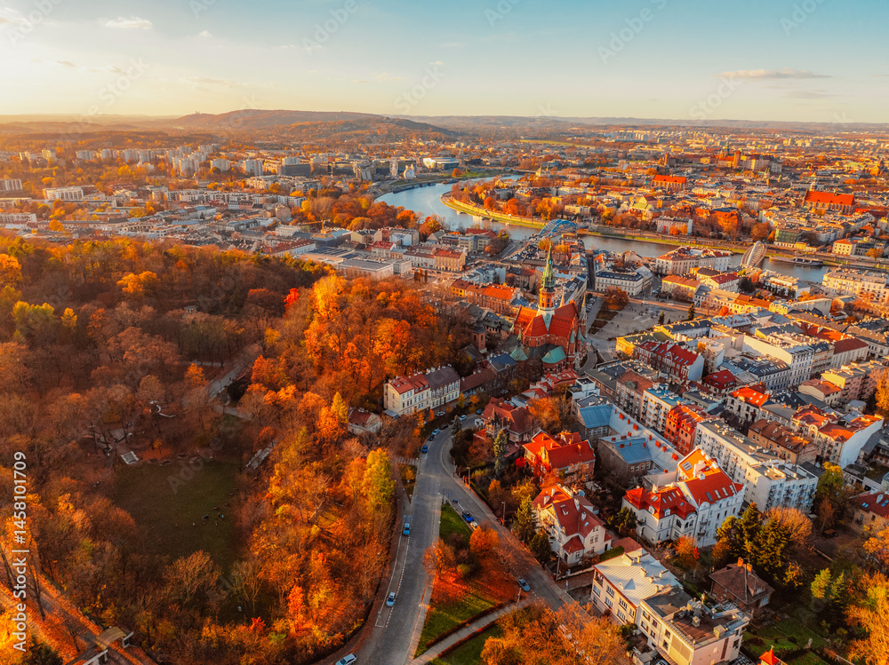 Church Saint Joseph at Podgorski Square in Podgorze district city view near river in Krakow Poland. Autumn landscape on coast river Wisla.