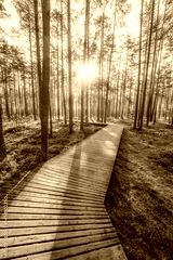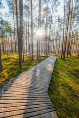 A wooden walking path Bor na Czerwonem nature reserve in Nowy Targ in Poland