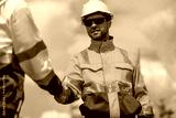 Industrial engineer holding hand cooperation inspection recording data at gas or petrochemical facility importance of safety, organization, and environmental awareness in industrial settings.