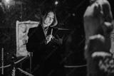 A woman observes and studies sculptures in a museum, using a tablet for notes and research. The scene highlights curiosity, learning, and admiration for art in a cultural environment.