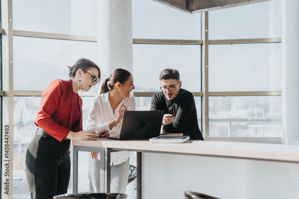 Business employees engage in a collaborative discussion around a laptop in a bright, modern office kitchen. The team displays positive interaction and teamwork in a professional environment.