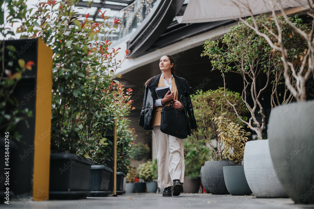 A young businesswoman walking along a walkway with confidence, holding documents and a bag amidst potted plants, presenting an inspiring urban outdoor scene of professionalism and fresh ambiance.