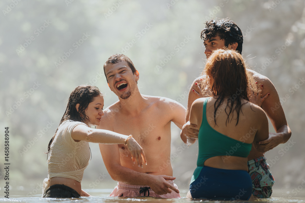 A happy group of young friends laughing and having fun while swimming in a scenic natural setting. Perfect representation of friendship, joy, and outdoor adventure.
