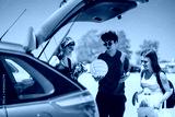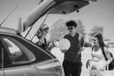 Group of young friends, smiling and excited, gather around a car trunk at an outdoor location while handling items for an activity. The sunny weather and cheerful environment enhance their lively mood