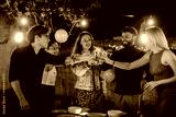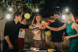Friends enjoying an evening birthday party outdoors, surrounded by festive decorations and good company.