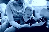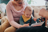 A parent and baby bonding on a sofa. The moment displays affection and learning as the parent helps their child explore a notebook under the natural light of a cozy living room.